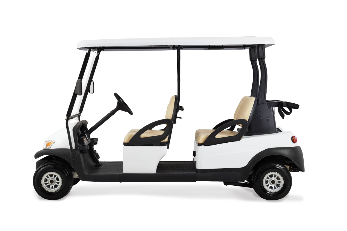 รถกอล์ฟไฟฟ้า 4 ที่นั่ง  เหมาะสำหรับใช้งานรับรองแขกคนสำคัญ มีกระจกมองข้าง,หลัง และชุดไฟส่องสว่าง เพื่อเพิ่มทัศนวิสัยและความมั่นใจในการขับขี่